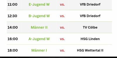 Der Ligaalltag kehrt auch bei den Jugendteams zurück und wir sind dabei mit einem großen Heimspieltag direkt mit dabei: Schaut am Sonntag in der Hinterlandhalle vorbei, wenn u.a. die Männer der Ersten und Zweiten auf Punktejagd gehen! Mit den Partien gegen Wettertal II und Cölbe stehen schwere Aufgaben an – über Unterstützung von der Tribüne freuen wir uns! Für Verpflegung wird wie immer gesorgt sein. Auswärts müssen ebenso 3 Jugendteams…