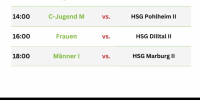 Auswärtsspiele für die Männer I und II: Die Männer der Zweiten wollen nach ihrem Heimerfolg auch auswärts an die gute Leistung anknüpfen. Das Hinspiel gegen Homberg konnte in Biedenkopf gewonnen werden – wir drücken die Daumen! Die Männer der Ersten haben die nächste schwere Auswärtsaufgabe vor der Brust: Mit der HSG Mörlen II erwartet uns ein Gegner, welcher stets spannende Spiele verspricht. Fahrt gerne mit und feuert unser Team an!…